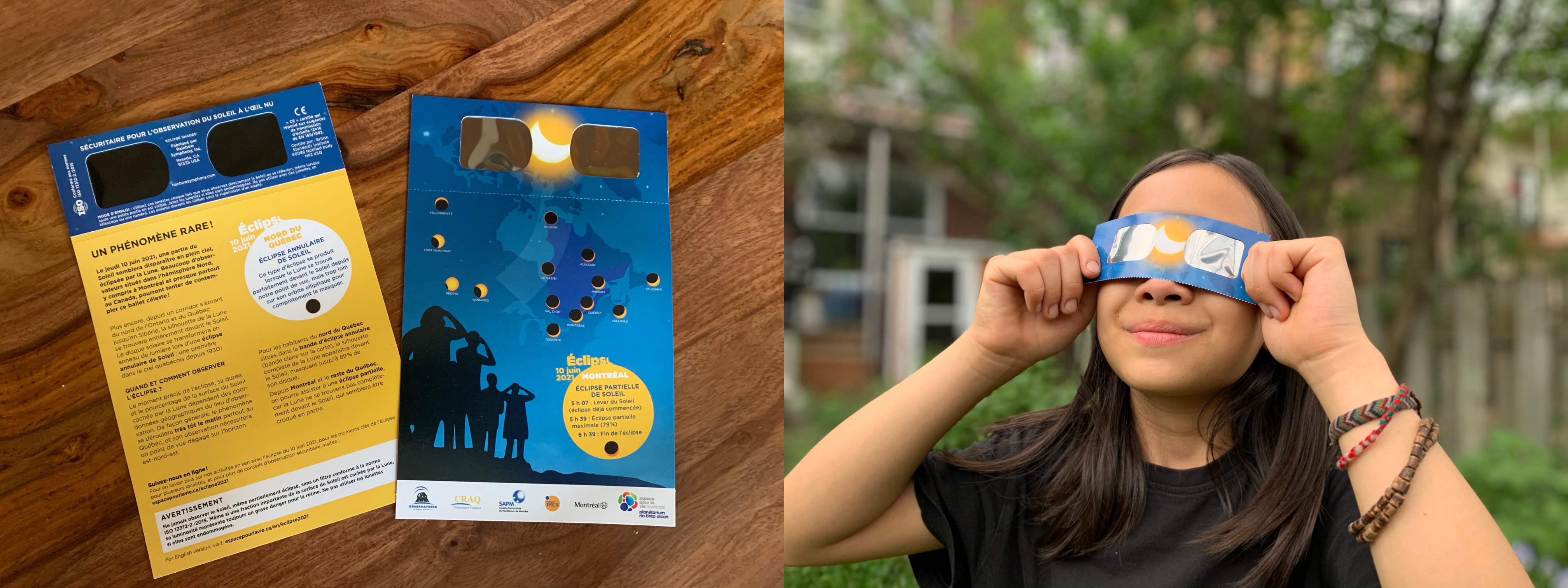 À Montréal, ce sont plus de 4 000 filtres solaires qui seront distribués gratuitement grâce à une initiative conjointe de l’iREx, du Planétarium Rio Tinto Alcan d’Espace pour la vie, du Centre de recherche en astrophysique du Québec, de l’Observatoire du Mont-Mégantic et de la Société d’astronomie du Planétarium de Montréal.