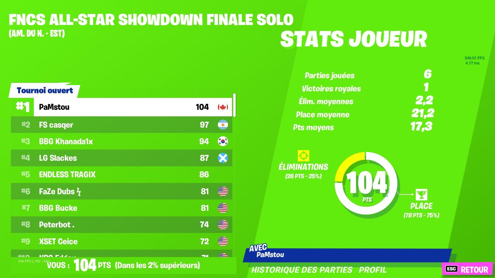 Pour voir les statistiques de Vincent Fortin et de sa victoire au FNCS : fortnite-esports.fandom.com/wiki/PaMstou