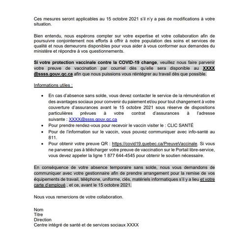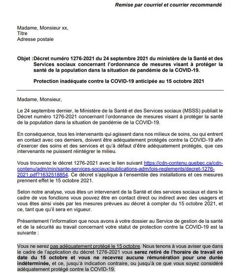 TVA Nouvelles a obtenu une copie du modèle de lettre qui sera envoyée à ces employés du réseau de la santé à partir du vendredi 1er octobre.