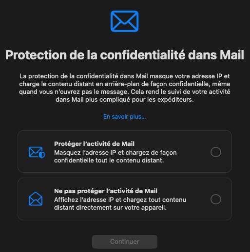 Une fois l’installation terminée, la nouvelle protection de la confidentialité du système vous demandera si vous désirez masquer votre adresse IP. Cette fonction empêche les expéditeurs de savoir si un courriel a été ouvert et masque les adresses IP afin que ces derniers ne puissent pas connaître l'emplacement d'un utilisateur ou l'utiliser pour établir un profil sur lui.