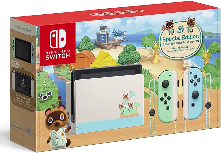 L’ensemble Animal Crossing: New Horizons comporte une édition spéciale de la Nintendo Switch avec deux Joy-Con de couleur menthe et bleu poudre, ainsi qu’une station d’accueil aux couleurs et aux motifs du titre. À noter que le jeu n’est pas inclus dans cet ensemble.