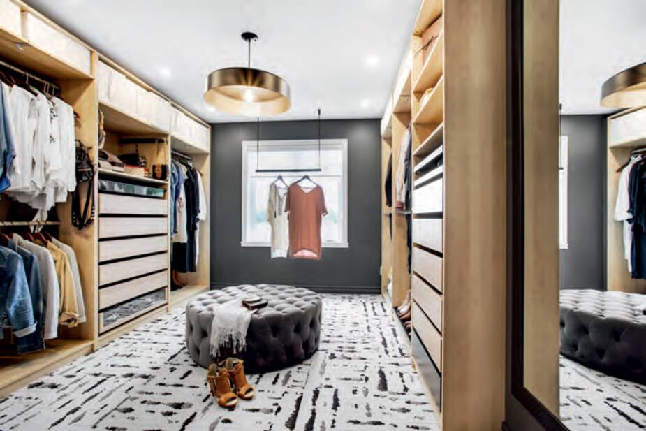 Le walk-in de la propriétaire était déjà aménagé, mais on a demandé à Isabelle Viau de lui donner un effet wow! très féminin. Elle a recouvert le plancher de carreaux de tapis au motif moderne et intégré un pouf capitonné luxueux ainsi qu’un lustre doré au fini brillant.