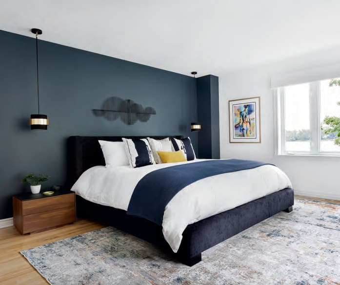 Lit et tables de chevet Mobican • Suspensions Royaume Luminaire • Housse de couette blanche sur mesure, tapis et décoration murale par l’entremise de DécoStyle Design • Coussins West Elm, zarahome.com • Jeté wayfair.ca • Accessoires décoratifs West Elm, Anthropologie, Zone