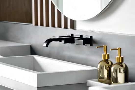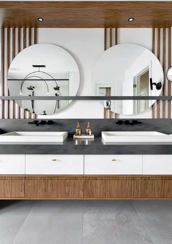 «Tout a été réfléchi en fonction des éléments dont la propriétaire avait besoin, comme des tiroirs pour ses accessoires et des miroirs avec éclairage à DEL réglable», précise la designer. Les finis noir et doré de la robinetterie et des accessoires, de même que les comptoirs en Corian gris et quartz blanc composent un décor d’esprit luxueux.