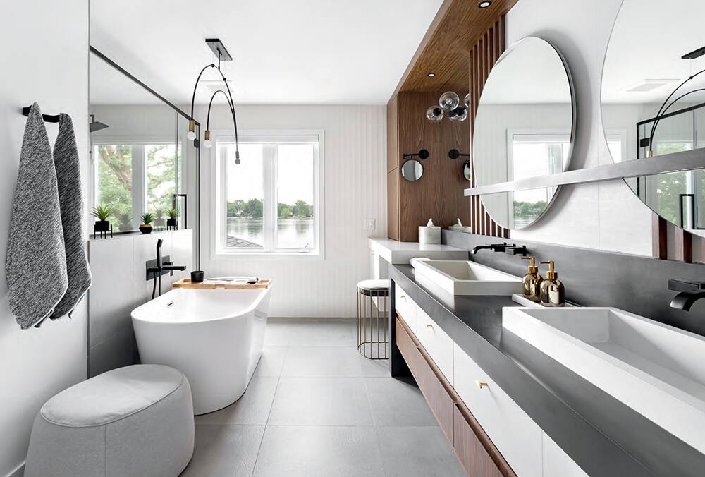 Meuble-lavabo en mélamine à effet bois et polymère blanc DécoStyle Design (conception); Ébénisterie Bercier (fabrication) • Lavabos en béton blanc Élément Béton • Baignoire Monaco de Neptune et robinetterie Baril et Brizo Espace Plomberium • Céramique Ramacieri Soligo • Tabouret DécoStyle Design (conception); Arrebeuri (base en métal peint) • Pouf Mobilia • Miroirs Paris Mirror • Lustre Royaume Luminaire • Appliques Multi Luminaire • Éclairage à DEL des miroirs Réno-Dépôt • Accessoires décoratifs Anthropologie, zarahome.com