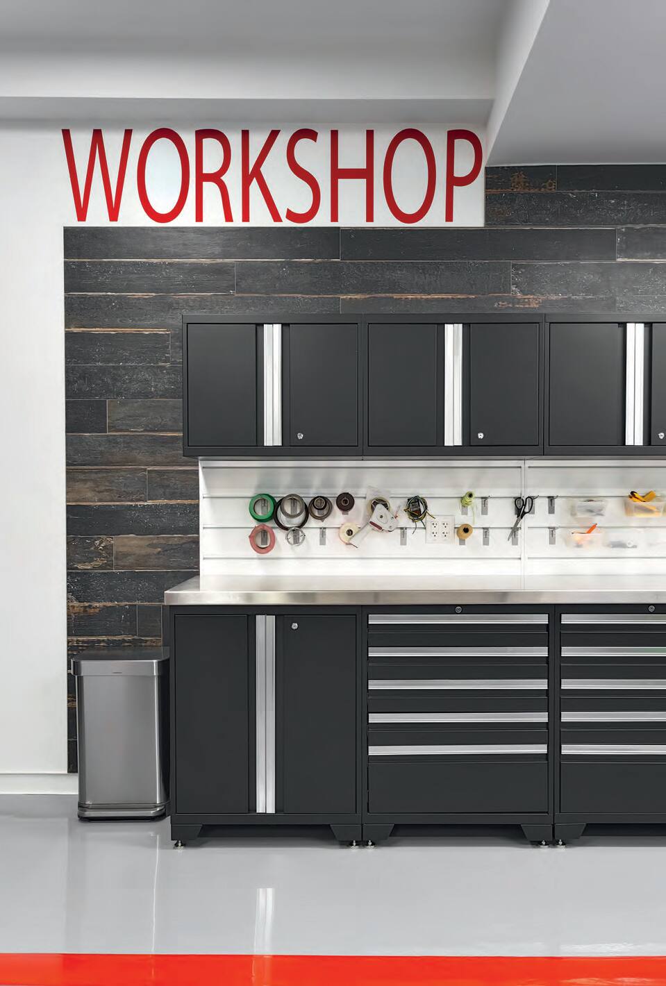 Armoires Design DécoStyle Design (conception); Ébénisterie Bercier (fabrication) • Établi Slatwall par l’entremise de DécoStyle Design • Céramique murale Ramacieri Soligo • Échelle Quincaillerie Richelieu • Décalque mural WORKSHOP DécoStyle Design (conception); Dgraphx (réalisation) • Plancher en époxy avec découpe Emard Couvre-Planchers