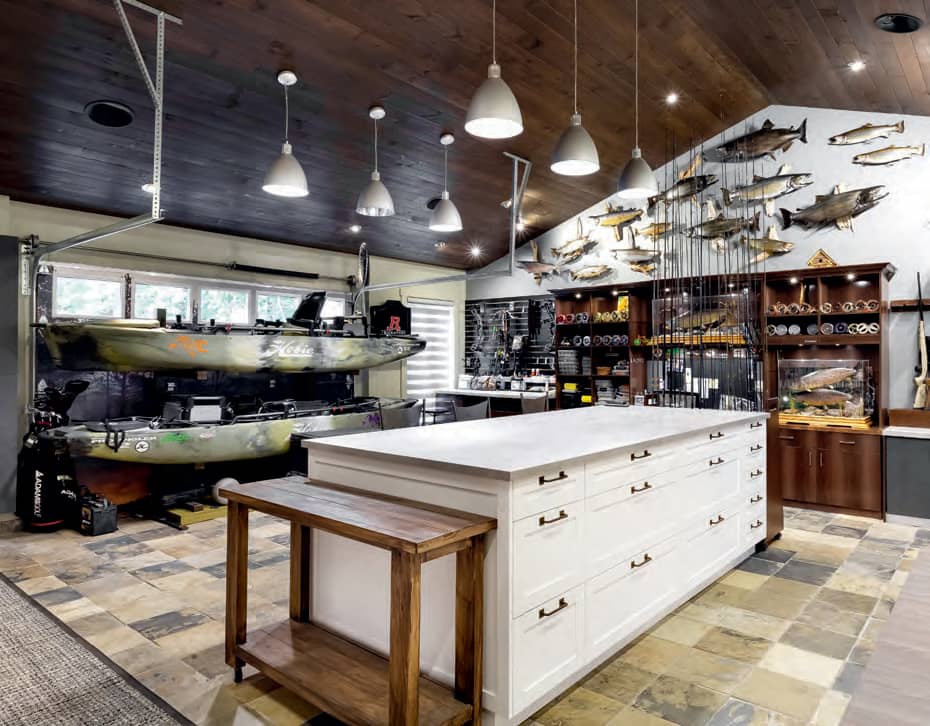 La man cave se trouve souvent au sous-sol... Eh bien ici, elle est dans le garage! Le propriétaire voulait un endroit hors du commun pour accueillir ses amis amateurs de plein air, de chasse et de pêche. Sa voiture reste donc à l’extérieur, laissant la place à un îlot surdimensionné.