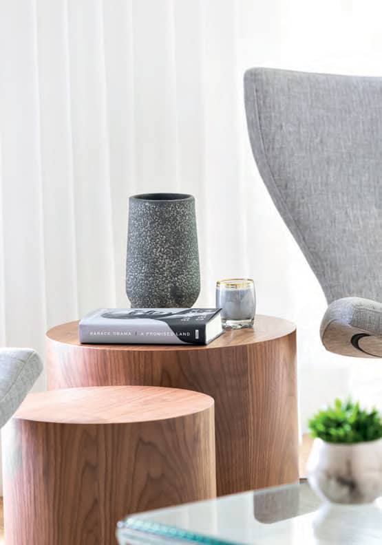 La proprio a aménagé la pièce dans des tons neutres de gris, de blanc et de crème. Conséquemment, l’ambiance y est très douce, simplement soulignée par quelques accents noirs. Pour rendre le tout chaleureux, elle a marié textures et motifs en ton sur ton.