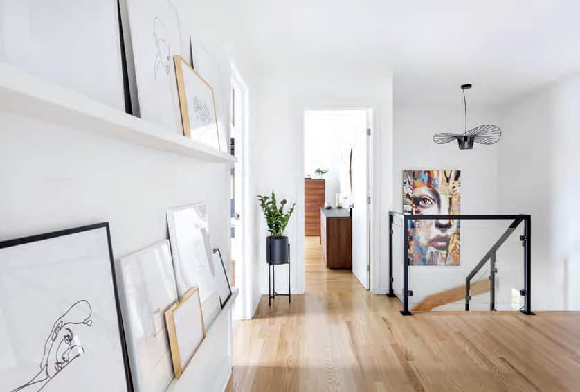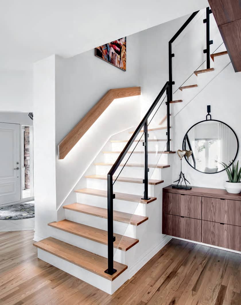 Escalier DécoStyle Design (conception); Construction Steve Dufour (fabrication) • Garde-corps en verre Vitrerie BV • Console sur mesure DécoStyle Design (conception); Ébénisterie Bercier (fabrication) • Miroir wayfair.ca