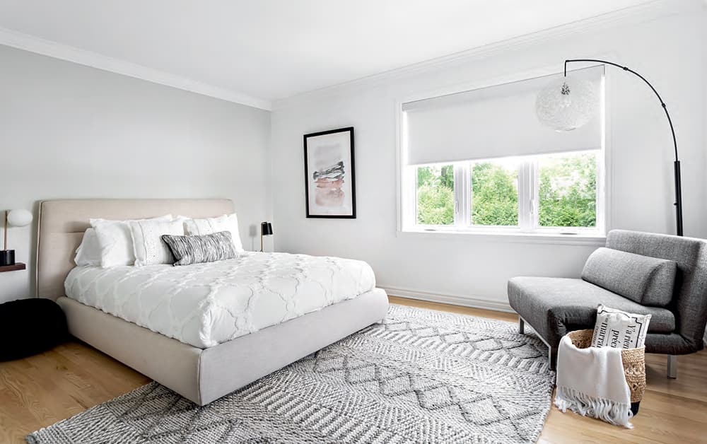 Lit Mobilia • Chevet et tapis Structube • Chaise rembourrée La Baie d’Hudson • Lampadaire, literie, coussins et cadre wayfair.ca • Store par l’entremise de DécoStyle Design