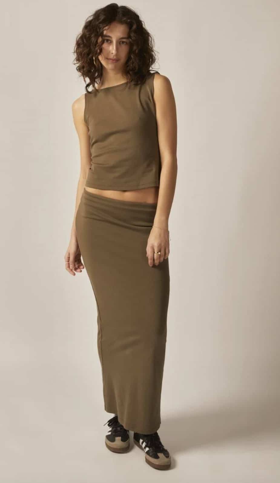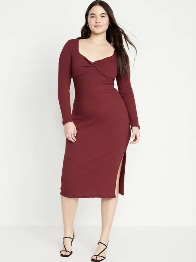 Robe mi-longue ajustée en tricot côtelé à devant torsadé